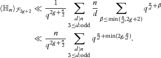 - (iii)\(n=2g+1:\) Since \(2g+2\ge n\), \(S(2g+2;n)=0\) and we get thatUsing (18),$$\begin{aligned} \langle {\mathcal P}_n \rangle _{{\mathcal F}_{2g+2}}= & {} \frac{n}{(q-1)q^{2g+1+\frac{n}{2}}} q S(2g;n),\\= & {} \frac{2g+1}{(q-1)q^{3g+\frac{1}{2}}} S(2g;2g+1). \end{aligned}$$By replacing \(\pi _q(2g+1)\) and simplifying, we obtain$$\begin{aligned} \langle {\mathcal P}_n \rangle _{{\mathcal F}_{2g+2}}= & {} \frac{2g+1}{(q-1)q^{3g+\frac{1}{2}}} \pi _q(2g+1)q^{\frac{(2g+1)-1}{2}}. \end{aligned}$$$$\begin{aligned} \langle {\mathcal P}_n \rangle _{{\mathcal F}_{2g+2}}= & {} \frac{2g+1}{(q-1)q^{3g+\frac{1}{2}}} \left( \frac{q^{2g+1}}{2g+1}+O\left( \frac{q^g}{2g+1}\right) q^g\right) \\= & {} \frac{q^{\frac{1}{2}}}{q-1}+O(q^{-g}). \end{aligned}$$